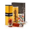 Inhoud Voorraadblik spaghetti, 85 x 85 x 300 mm Servetten, 33 x 33 cm Spaghettitang rvs, 21 x 6 x 4 cm Galvanina Spritz 0.0% Bio, 200 ml Spaghetti, 400 gram Pastasaus napolitana, 230 gram Verpakt in een feestelijke geschenkdoos, 310 x 200 x 100 mm