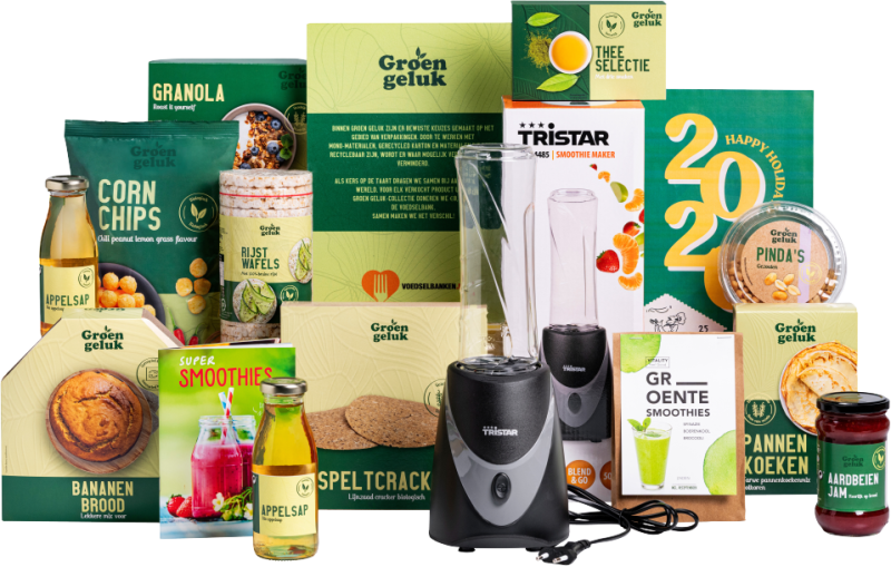 Inhoud Smoothiemaker Tristar Appelsap BIO, 250 ml, 2 st Super Smoothies receptenboekje Bananenbrood mix, 200 gram Pannenkoekenmix volkoren, 300 gram Granola roast it yourself, 100 gram Halva vruchtenjam aardbei, 320 gram Thee selectie, 3 smaken Pinda's gezouten BIO, 150 gram Rijstwafels, 100 gram Groente Smoothies met vitale recepten BIO Corn chips chili peanut lemon grass, 75 gram Rustieke speltcracker BIO, 4 st Gratis kaart met eindejaarspuzzel Verpakt in een feestelijke geschenkdoos, 390 x 290 x 200 mm