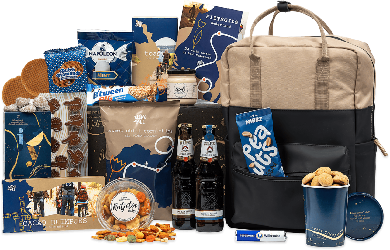 Inhoud Fietsrugtas RPET duurzaam, 38 x 28 x 12 cm Fietsgids Nederland Bier Alfa donkerbruin fles, 30 cl Bier Alfa krachtig dort fles, 30 cl Napoleon mintkogels, 80 gram Ratjetoe, 100 gram Cookies, 100 gram Cacao duimpjes, 90 gram Sneeuwballen, 60 gram Corn chips, 75 gram Stroopwafel duopak, 64 gram PindaΓÇÖs, 50 gram Toast, 75 gram Aioli, 190 gram Pepermunt, 40 gram Hero B'tween reep, 50 gram Fletcher hotels voordeelvoucher Verpakt in een feestelijke geschenkdoos, 39 x 29 x 20 cm
